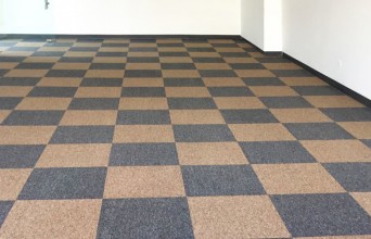 พรมแผ่นปูแบบตารางหมากฮอต ลูกค้าเลือกใช้พรมโทนสีครีมอ่อนสลับกับสีครีมเข้ม ช่วยสร้างบรรยากาศภายในห้องให้ดูผ่อนคลาย นุ่มนวล และสวยงามมากขึ้น
